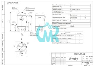 Ресивер вертикальный воздушный РВ 280-02/10 с объемом 280 л рассчитан на максимальное рабочее давление 10 атм и температуру эксплуатации от - 60 до + 100°C, изготовлен из нержавеющей стали 12Х18Н10Т. Габариты 68×66×132 см, масса 90 кг.